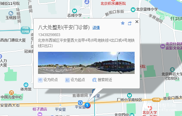 北京站110米向西步行 到 北京站 C東南出口 進站8站乘 地鐵2號線內(nèi)環(huán) (崇文門方向) 到 車公莊150米向東步行 到 車公莊1站乘 地鐵6號線 (潞城方向) 到 平安里G口(東南口) 出站160米向東步行 到 北京八大處平安整形外科門診部
