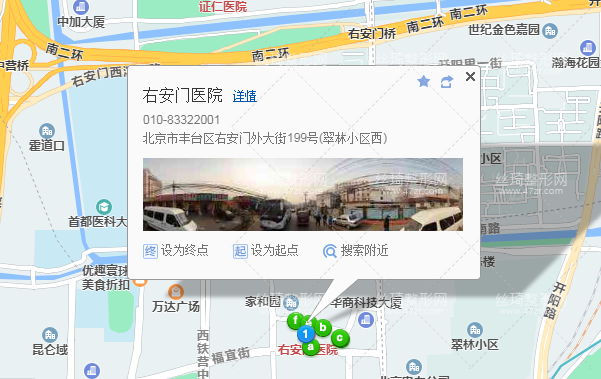 北京西站170米向北步行 到 北京西站 B東南入口進(jìn)站3站乘 地鐵7號線 (花莊方向) 到 廣安門內(nèi) C2口(東南口) 出站320米向東步行 到 廣安門內(nèi)7站乘 19路 (翠林小區(qū)方向) 到 翠林小區(qū)370米向西步行 到 右安門醫(yī)院