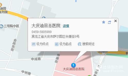 大慶站900米向東步行 到 力佳廣場(chǎng)2站乘 803路 (大慶東站方向) 到 油田總醫(yī)院340米向東北步行 到 大慶油田總醫(yī)院