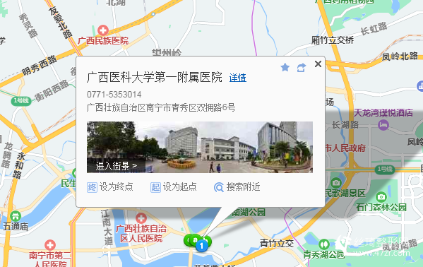 南寧站160米向東南步行 到 火車站8站乘 32路 (青秀山北門(鳳嶺南青秀路口)方向) 到 醫(yī)科大一附院140米向南步行 到 廣西醫(yī)科大學(xué)第一附屬醫(yī)院