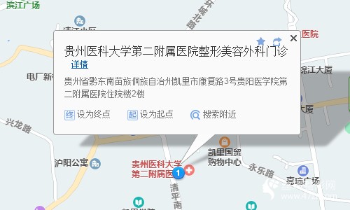 凱里站40米向南步行 到 火車站12站乘 20路 (凱里高鐵南站方向) 到 金凱大廈390米向東南步行 到 貴州醫(yī)科大學第二附屬醫(yī)院-整形美容外科門診