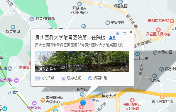 貴陽站160米向西北步行 到 貴陽火車站 B口 進站4站乘 軌道交通1號線 (竇官方向) 到 北京路 B口 出站280米向東步行 到 北京路1站乘 316路 (友鄰路方向) 或 12路 273路 到 貴州醫(yī)科大學350米向西步行 到 貴州醫(yī)科大學附屬醫(yī)院第二住院樓