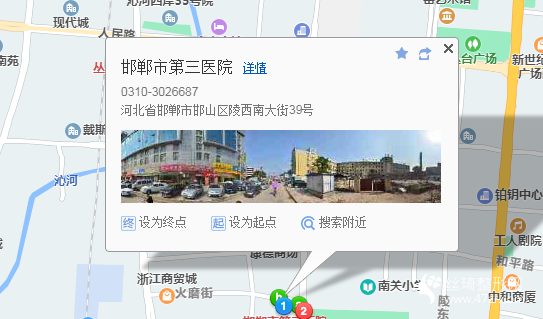 邯鄲站250米向東北步行 到 和平路浴新街口(火車站)3站乘 50路 (成安·黃龍村方向) 到 市第三醫(yī)院80米向南步行 到 邯鄲市第三醫(yī)院