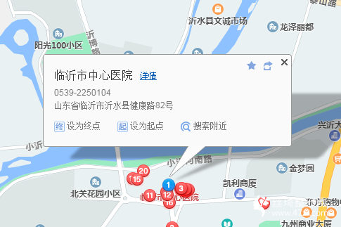 沂水站2公里向東步行 到 前岔河10站乘 吳家安子-沂水 (沂水方向) 到 沂水20米向東步行 到 沂水汽車站11站乘 王莊-沂水 (西峰峪方向) 或 沂水-龍灣 柴山-沂水 新民-諸葛-沂水 泉莊-沂水 院東頭-沂水 到 中心醫(yī)院西190米向北步行 到 沂水中心醫(yī)院