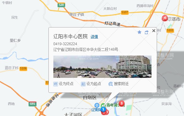遼陽站320米向西南步行 到 遼陽客運站4站乘 燈塔-遼陽東線 (燈塔客運站方向) 到 市中心醫(yī)院250米向西北步行 到 遼陽市中心醫(yī)院整形科