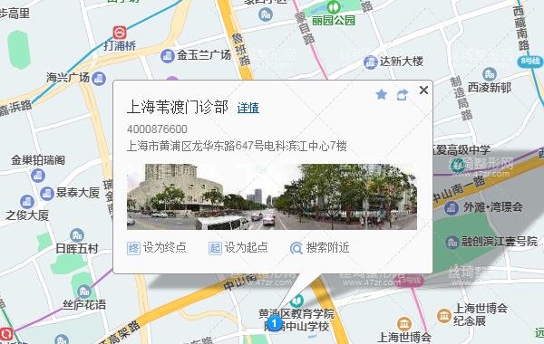 上海站120米向東南步行 到 上海火車站 2口 進站1站乘 地鐵1號線 (莘莊方向) 到 漢中路150米向東步行 到 漢中路6站乘 地鐵13號線 (張江路方向) 到 世博會博物館 2口 出站860米向西南步行 到 上海葦渡門診部