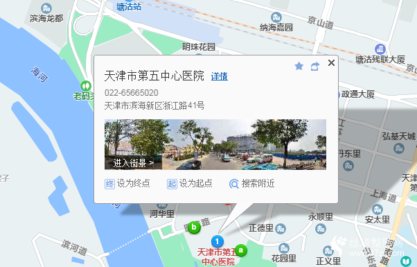 天津站1.1公里向西南步行 到 天津站海河廣場5站乘 651路 (天津科技大學西院方向) 到 塘沽火車站(營口道)8米站內換乘 109路5站乘 109路 (新河莊(廣州道)方向) 到 天津市第五中心醫(yī)院(醫(yī)院路)120米向西南步行 到 天津市第五中心醫(yī)院