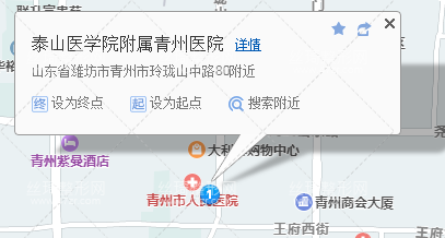 青州市站190米向西步行 到 火車站17站乘 青州9路 (濰坊護(hù)理職業(yè)學(xué)院方向) 到 大利群商場420米向東南步行 到 泰山醫(yī)學(xué)院附屬青州醫(yī)院