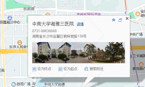 長沙站110米向北步行 到 長沙火車站(北坪)1站乘 225路 (五星小區(qū)方向) 到 五一大道長島路口12站乘 118路 (麓谷城鐵站方向) 或 405路 到 湘雅三醫(yī)院50米向西北步行 到 中南大學湘雅三醫(yī)院