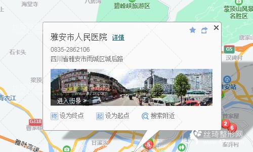 3、雅安站600米向東南步行 到 雅安火車站18站乘 7路 (平安小區(qū)方向) 到 青衣江路中段1.3公里向西南步行 到 雅安市人民醫(yī)院,