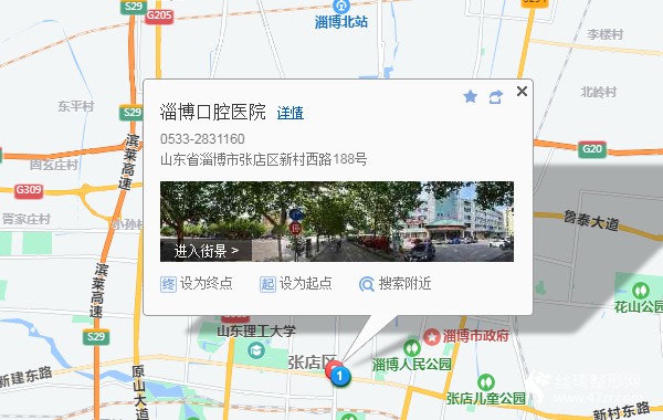 淄博站220米向西北步行 到 火車站7站乘 121路 (楊樓方向) 到 西六路新村路口700米向西步行 到 淄博口腔醫(yī)院