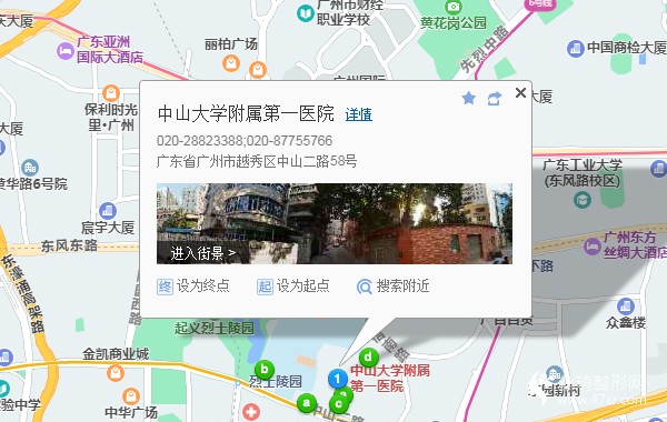 廣東省汽車客運站210米向東步行 到 廣州火車站 F口 進站3站乘 地鐵5號線 (文沖方向) 到 區(qū)莊130米向東步行 到 區(qū)莊1站乘 地鐵6號線 (潯峰崗方向) 到 東山口1站乘 地鐵1號線 (西塱方向) 到 烈士陵園 C口 出站450米向東步行 到 中山大學附屬第一醫(yī)院