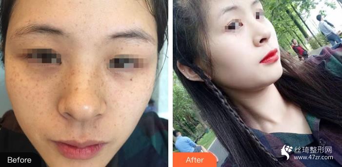 術后第一天,臉還是有些紅,只好買了個口罩戴著出門,到下午的時候就好很多了,沒那么紅了。第二天早上起來照鏡子的時候發(fā)現(xiàn)臉上的斑少了起碼有一半,小點兒的斑基本上消了百分之七八十的樣子,但是顏色深一點的,大一點斑還在。醫(yī)生說我的斑還需要再做一次才能去掉。為了給大家做參考,照片就不美顏了,看圖吧。
