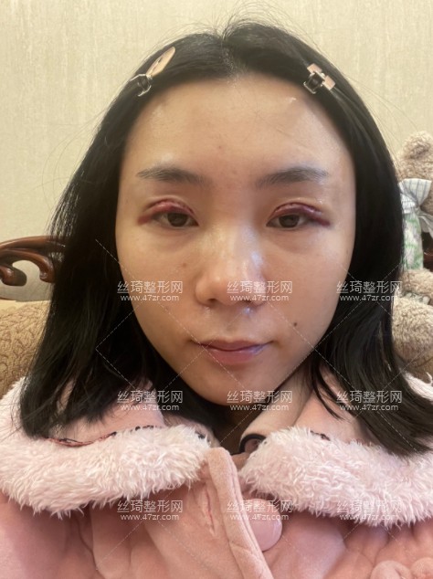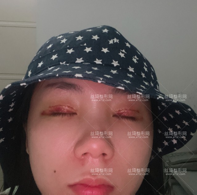 術后第3天,每天睜開眼睛第一件事情就是照鏡子,由于血液不循環(huán),眼皮還是很腫的,眼皮兒還有點淤青,挺擔心的,還沒有拆線,現(xiàn)在就想趕緊拆線,看有沒有留疤,閉眼眼睛還是較為對稱的