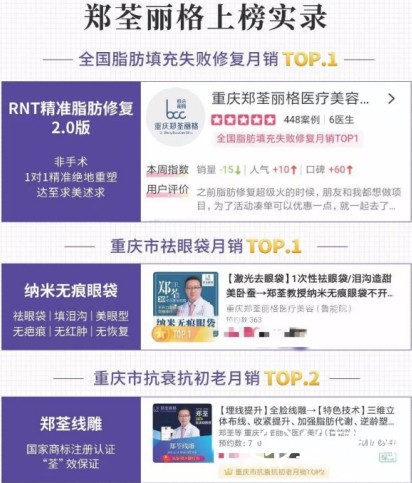 據(jù)悉,鄭荃麗格成立至今,圍繞抗衰年輕化為發(fā)展方向,秉承著集團(tuán)“以醫(yī)生為核心,以技術(shù)為導(dǎo)向”,已經(jīng)面向市場推出多款獨(dú)特醫(yī)美項(xiàng)目,特別在面部抗衰老領(lǐng)域,在知名電商APP全網(wǎng)排行榜中,鄭荃麗格獨(dú)特醫(yī)美項(xiàng)目RNT脂肪修復(fù)、納米微創(chuàng)眼袋等為代表多項(xiàng)明星產(chǎn)品銷量排在全 國 第 一位及重慶市第 一位。